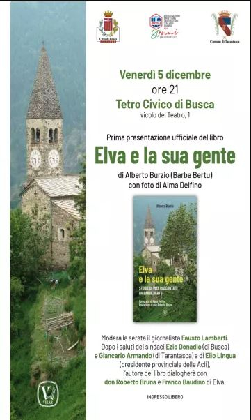 Venerdì 5 dicembre, alle ore 21, il Teatro Civico di Busca ospiterà la prima presentazione del libro “Elva e la sua gente” di Alberto Burzio (Barba Bertu), con fotografie di Alma Delfino. La serata sarà moderata dal giornalista Fausto Lamberti. l’autore dialogherà con don Roberto Bruna e Franco Baudino, entrambi di Elva. L’ingresso è libero e aperto a tutta la cittadinanza.