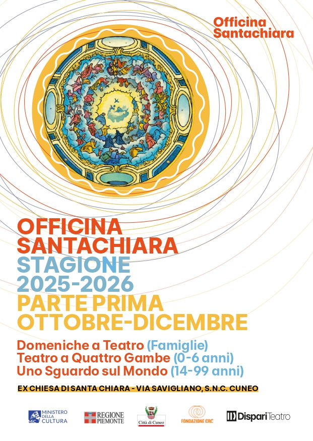 Sabato 6 dicembre alle ore 10.30 presso l'Officina Santachiara (ex chiesa di Santa Chiara, via Savigliano, Cuneo), la Compagnia CONsonanTE di Saluzzo presenta "Non si può passare sopra, non si può passare sotto", uno spettacolo-laboratorio per bambini e bambine dai 0 ai 3 anni e le loro famiglie, per scoprire parole, suoni e gioco condiviso. Ingresso unico € 4,00. L'evento fa parte della rassegna di spettacoli organizzati da Dispari Teatro, clicca qui per scoprire il programma completo.